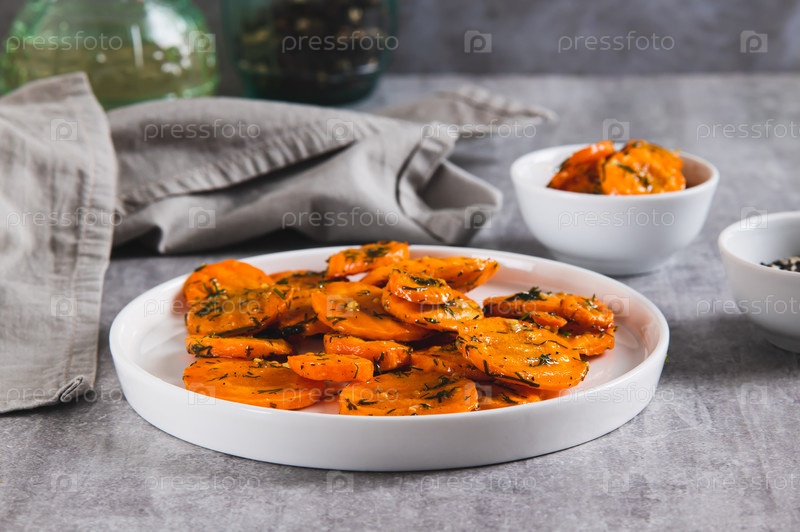 Кусочки жареной моркови с чесноком и травами на тарелке за столом