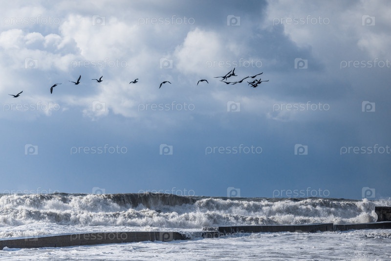Мигрирующие птицы летают низко над большими штормовыми волнами. Ураган в Черном море. Геленджик. Солнце, пена, брызги