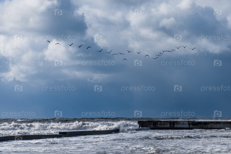 Мигрирующие птицы летают низко над большими штормовыми волнами. Ураган в Черном море. Геленджик. Солнце, пена, брызги