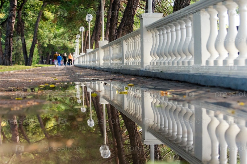 Набережная с балюстрадой после дождя. Балустрада отражается в луже. Сосны над набережной. Люди ходят по прогулочной дорожке издалека