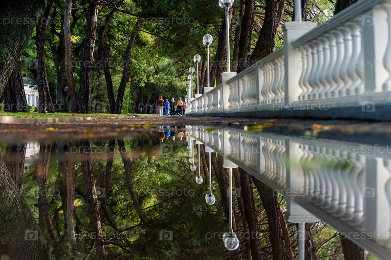 Набережная с балюстрадой после дождя. Балустрада отражается в луже. Сосны над набережной. Люди ходят по прогулочной дорожке издалека