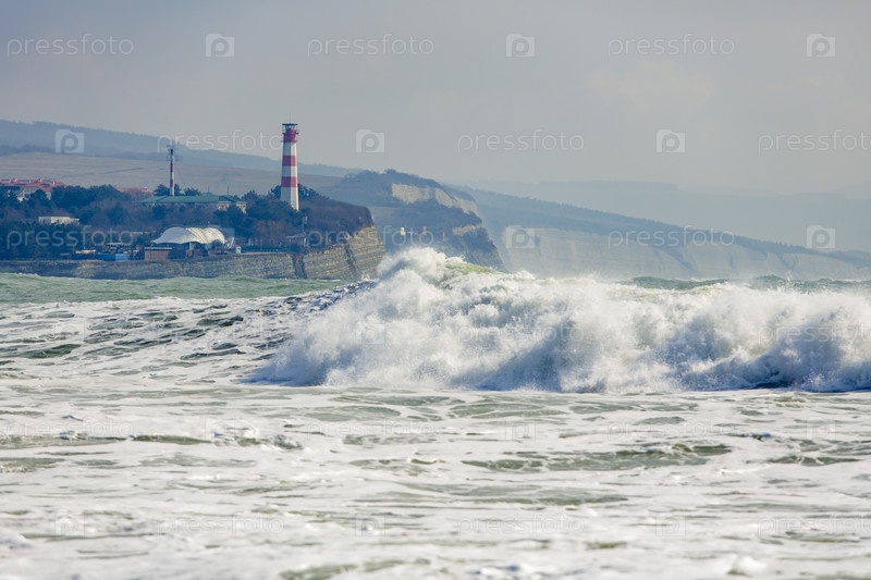 Геленджикский маяк в сильный шторм. Волны из пены и спрея бушуют перед маяком. Маяк стоит на высоком крутом берегу