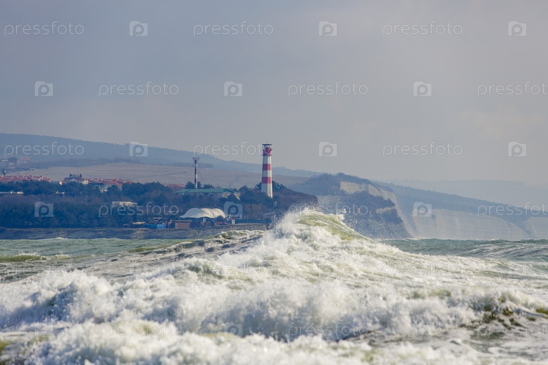 Геленджикский маяк в сильный шторм. Волны из пены и спрея бушуют перед маяком. Маяк стоит на высоком крутом берегу