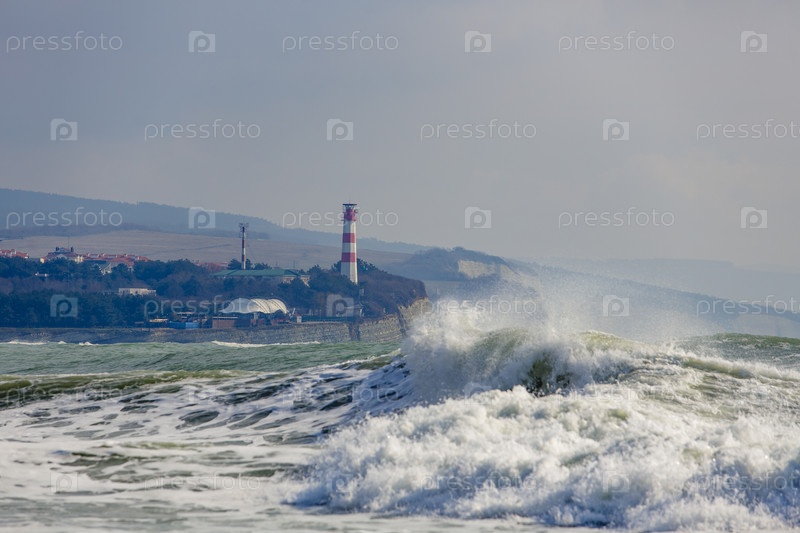 Геленджикский маяк в сильный шторм. Волны из пены и спрея бушуют перед маяком. Маяк стоит на высоком крутом берегу