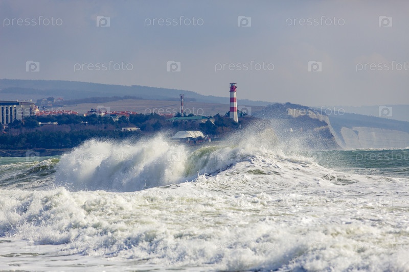 Геленджикский маяк в сильный шторм. Волны из пены и спрея бушуют перед маяком. Маяк стоит на высоком крутом берегу