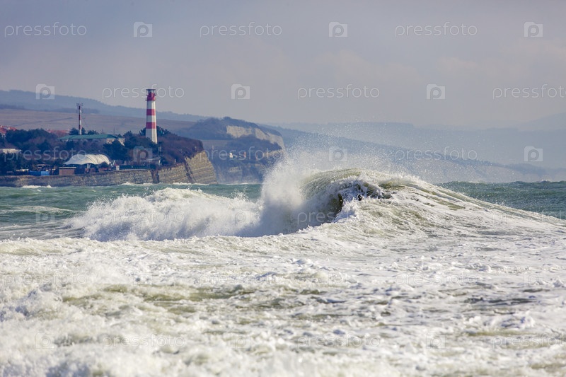 Геленджикский маяк в сильный шторм. Волны из пены и спрея бушуют перед маяком. Маяк стоит на высоком крутом берегу