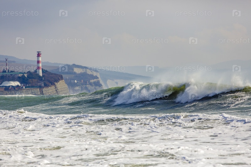 Геленджикский маяк в сильный шторм. Волны из пены и спрея бушуют перед маяком. Маяк стоит на высоком крутом берегу
