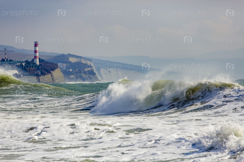 Геленджикский маяк в сильный шторм. Волны из пены и спрея бушуют перед маяком. Маяк стоит на высоком крутом берегу