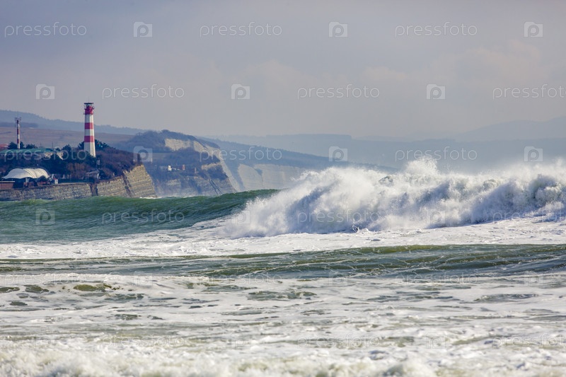 Геленджикский маяк в сильный шторм. Волны из пены и спрея бушуют перед маяком. Маяк стоит на высоком крутом берегу