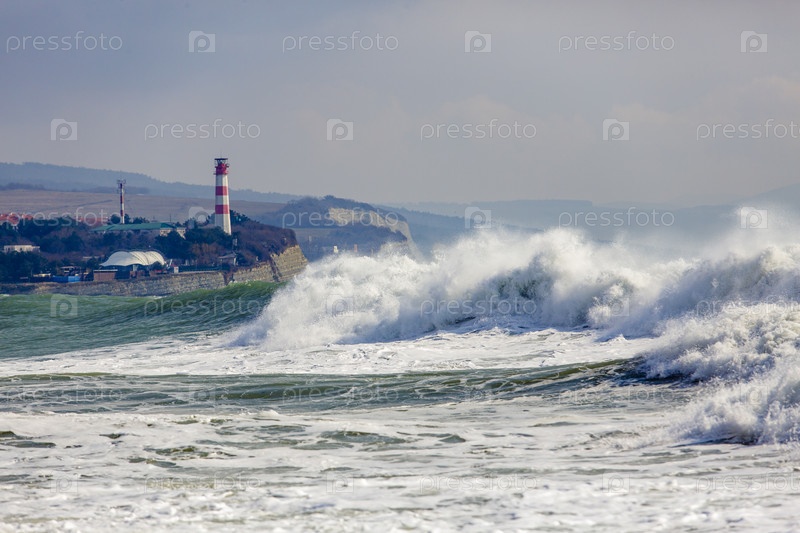 Геленджикский маяк в сильный шторм. Волны из пены и спрея бушуют перед маяком. Маяк стоит на высоком крутом берегу