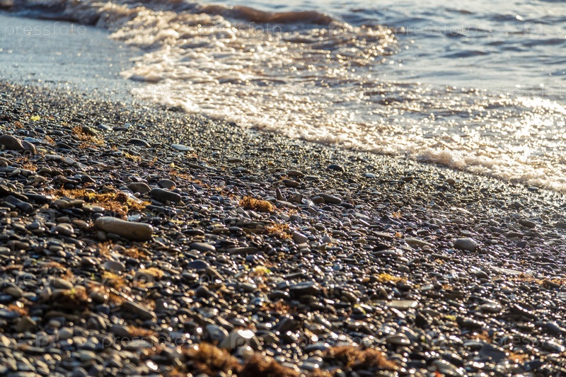 Скалистый пляж с небольшой волной на заднем плане