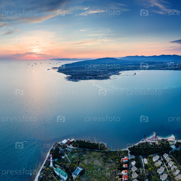 Геленджикский курорт на закате. Вид с воздуха Мы видим тонкий мыс и корабли, атакующие Новоосийск