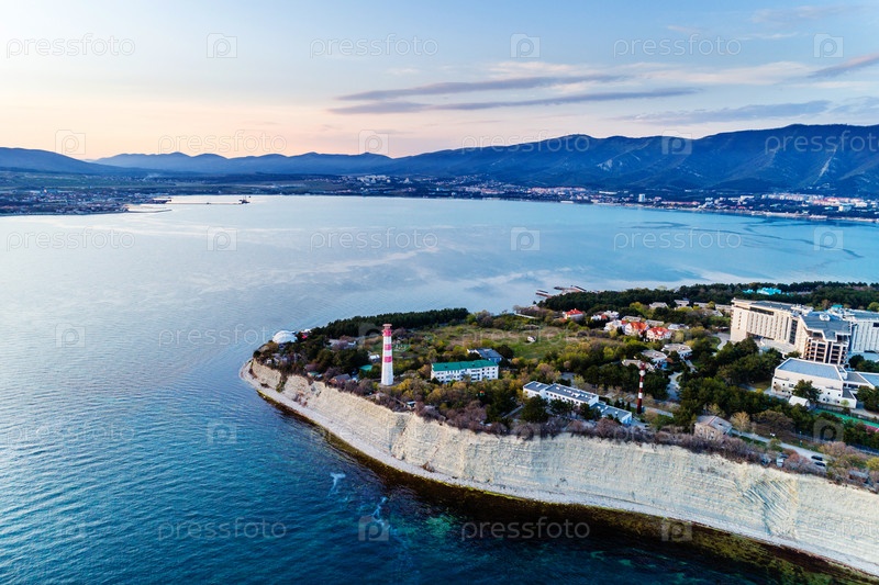 Скалистый мыс 'Толстой', курорт Геленджик.Закат солнца.Геленджикский маяк на скалистом берегу Куртома.Золотой залив и Кавказские горы в фоне.Вид с воздуха