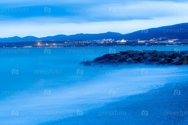 Шторм в Геленджике при длительной экспозиции. Волны в виде тумана врезаются в пляж Геленджика. Сумерки, закат солнца. Горы и городские огни на горизонте