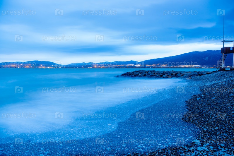 Шторм в Геленджике при длительной экспозиции. Волны в виде тумана врезаются в пляж Геленджика. Сумерки, закат солнца. Горы и городские огни на горизонте