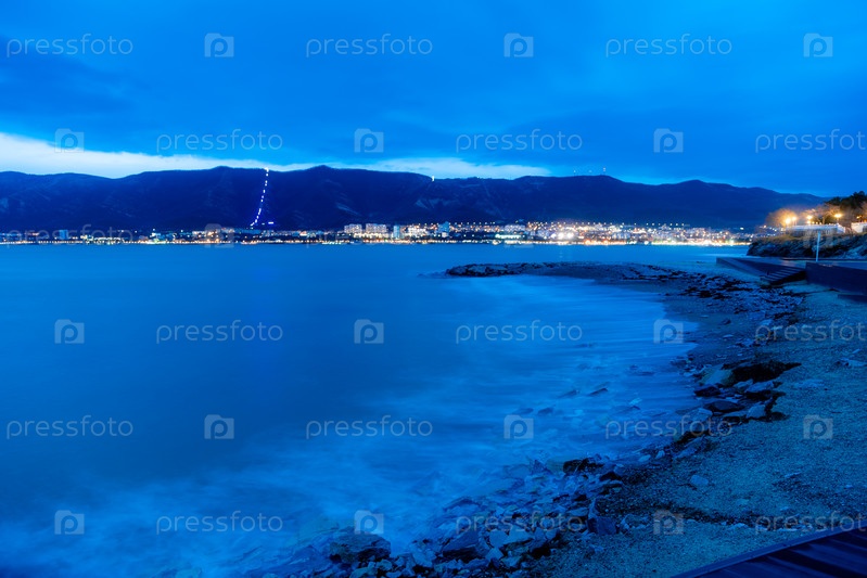 Шторм в Геленджике при длительной экспозиции. Волны в виде тумана врезаются в пляж Геленджика. Сумерки, закат солнца. Горы и городские огни на горизонте