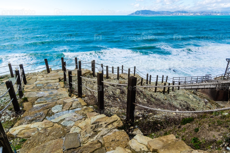 Кабардинский курорт.Каменные ступеньки ведут к завесе Черного моря.На горизонте порт Новороссийск и горы Кваказ