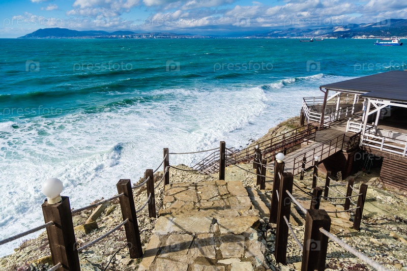 Кабардинский курорт.Каменные ступеньки ведут к завесе Черного моря.На горизонте порт Новороссийск и горы Кваказ
