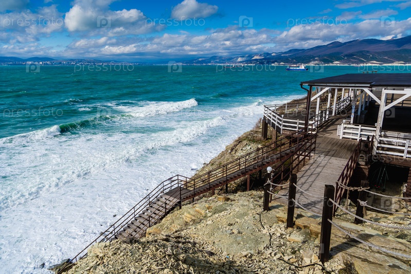 Курорт Кабардинка. Лестницы ведут к пляжу. Черное море спокойно, а вода голубая. Порт Новороссийск на заднем плане