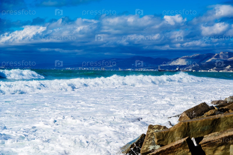 Большие зеленые штормовые волны в белой пены прокатываются по скалистому пляжу Кабардинки.На заднем плане - порт Новороссийск и Кавказские горы