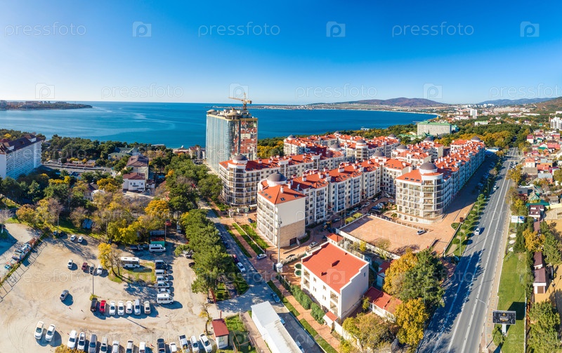 Панорама курорта Геленджик в солнечный день. это. на переднем плане - жилой комплекс, санатории. на заднем фоне: залив геленджик