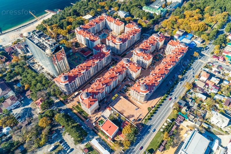 Многоэтажный жилой комплекс с красными крышами расположен на берегу залива Геленджик