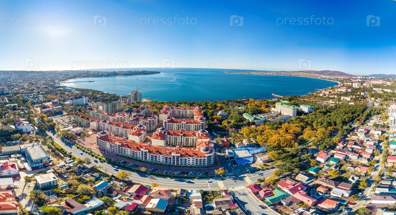 Панорама курорта Геленджик в солнечный день. это. на переднем плане - жилой комплекс, санатории. на заднем фоне: залив геленджик