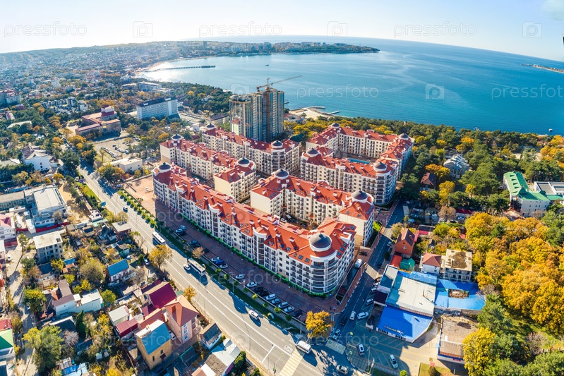 Панорама курорта Геленджик в солнечный день. это. на переднем плане - жилой комплекс, санатории. на заднем фоне: залив геленджик
