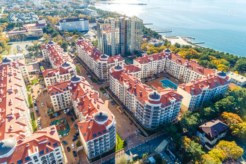 Многоэтажный жилой комплекс с красными крышами расположен на берегу Геленджикского залива