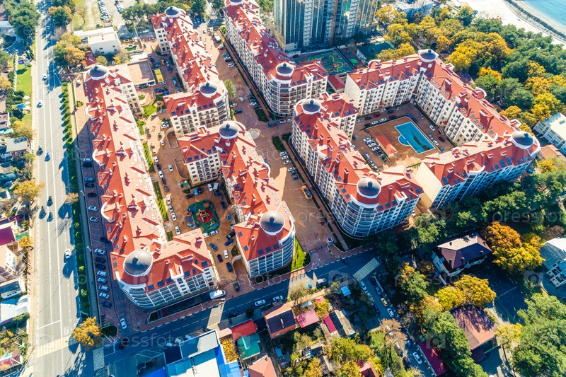 Геленджик курорт. многоэтажный жилой комплекс с красными крышами. вид сверху