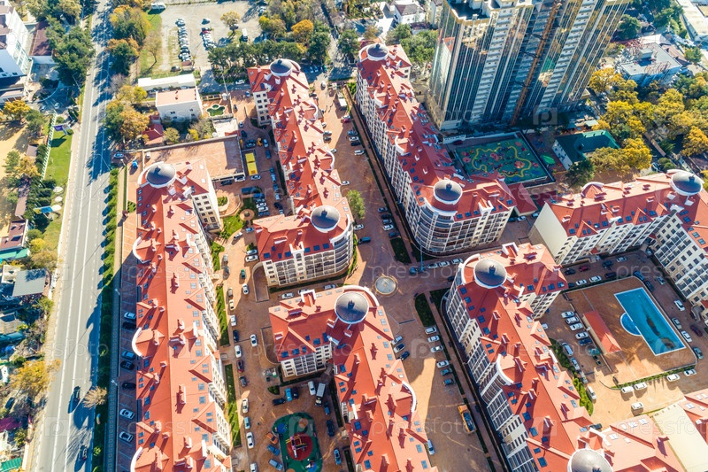 Геленджик курорт. многоэтажный жилой комплекс с красными крышами. вид сверху