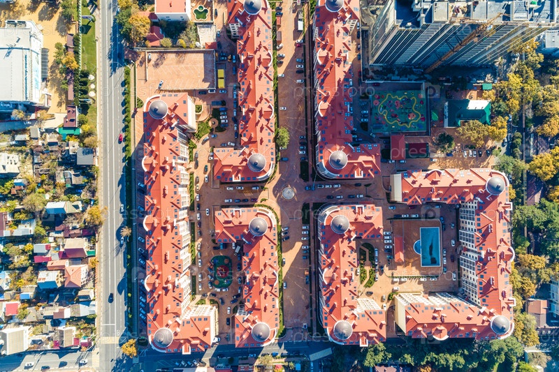 Геленджик курорт. многоэтажный жилой комплекс с красными крышами. вид сверху