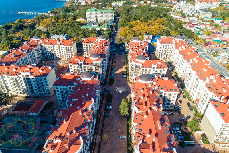 Многоэтажный жилой комплекс с красными крышами расположен на берегу Геленджикского залива