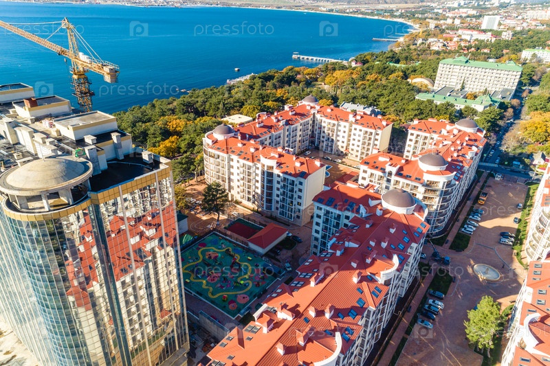 Многоэтажный жилой комплекс с красными крышами расположен на берегу Геленджикского залива