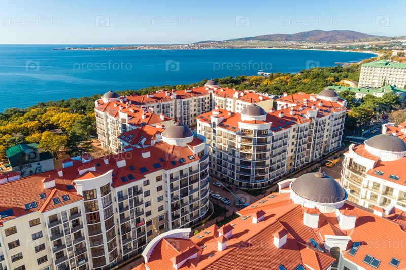 Многоэтажный жилой комплекс с красными крышами расположен на берегу Геленджикского залива