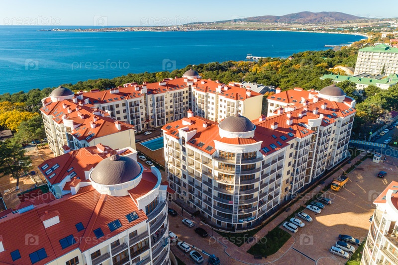 Многоэтажный жилой комплекс с красными крышами расположен на берегу Геленджикского залива