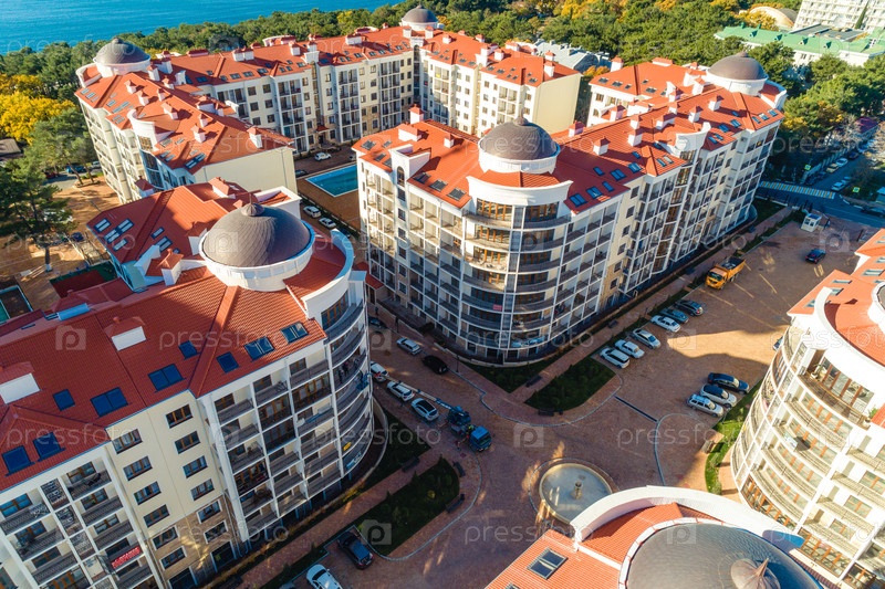Многоэтажный жилой комплекс с красными крышами расположен на берегу Геленджикского залива