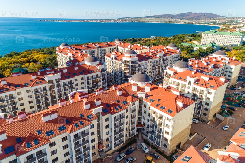 Многоэтажный жилой комплекс с красными крышами расположен на берегу Геленджикского залива