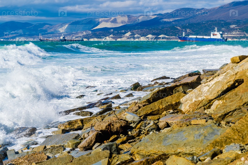 Кабардинский курорт. большие зеленые штормовые волны в белой пены прокатываются по скалистому пляжу Кабардинки. на заднем плане порт Новороссийск и Кавказские горы. крупные камни на берегу