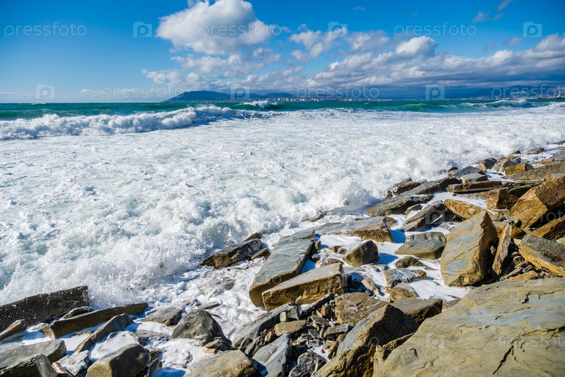 Кабардинский курорт. большие зеленые штормовые волны в белой пены прокатываются по скалистому пляжу Кабардинки. на заднем плане порт Новороссийск и Кавказские горы. крупные камни на берегу
