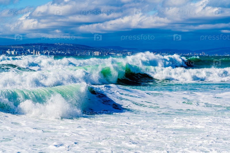 Курорт 'Кабардинка'.Черное море.Большие штормовые волны изумрудового цвета поднимаются на берег.Много спрея и пены.Порт Новороссийска и Кавказские горы на горизонте