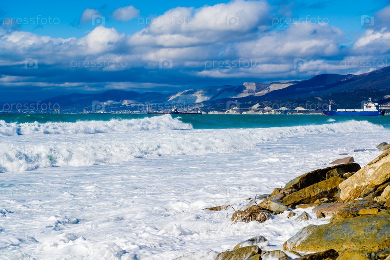 Кабардинский курорт. большие зеленые штормовые волны в белой пены прокатываются по скалистому пляжу Кабардинки. на заднем плане порт Новороссийск и Кавказские горы. огромные камни на берегу. вспышки и пена от волн