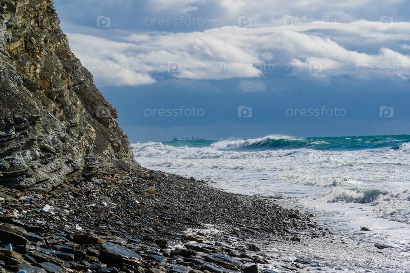 Курорт Кабардинка. буревые волны обрушились на крутые скалы. корабли на горизонте