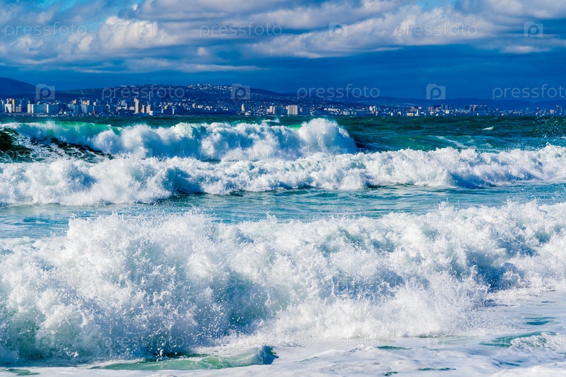 Курорт 'Кабардинка'.Черное море.Большие штормовые волны изумрудового цвета поднимаются на берег.Много спрея и пены.Порт Новороссийска и Кавказские горы на горизонте