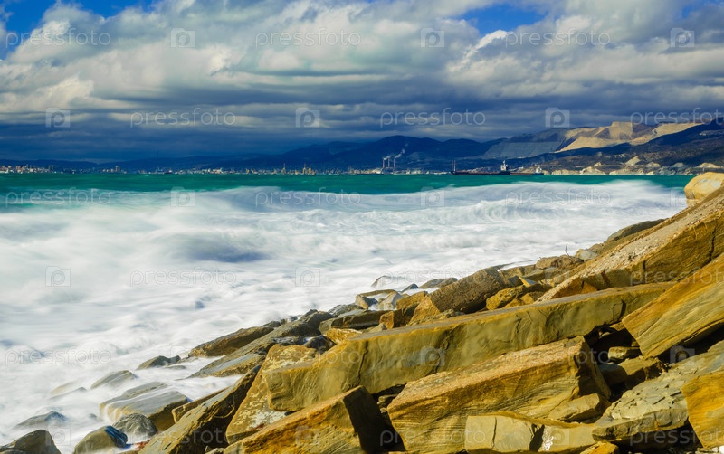 Курорт 'Кабардинка'.Большие зеленые штормовые волны в белой пены.На заднем плане порт Новороссийск и Кавказские горы.Огромные скалы на берегу.Фото длинной выставки