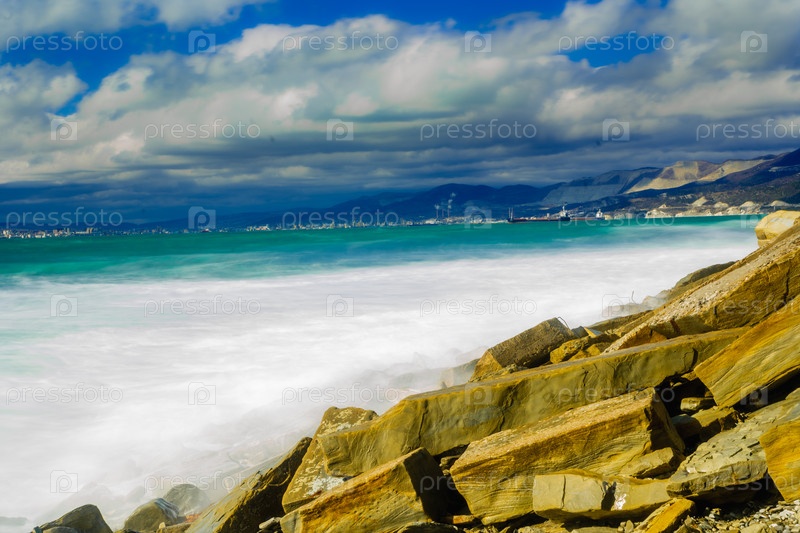 Курорт 'Кабардинка'.Большие зеленые штормовые волны в белой пены.На заднем плане порт Новороссийск и Кавказские горы.Огромные скалы на берегу.Фото длинной выставки
