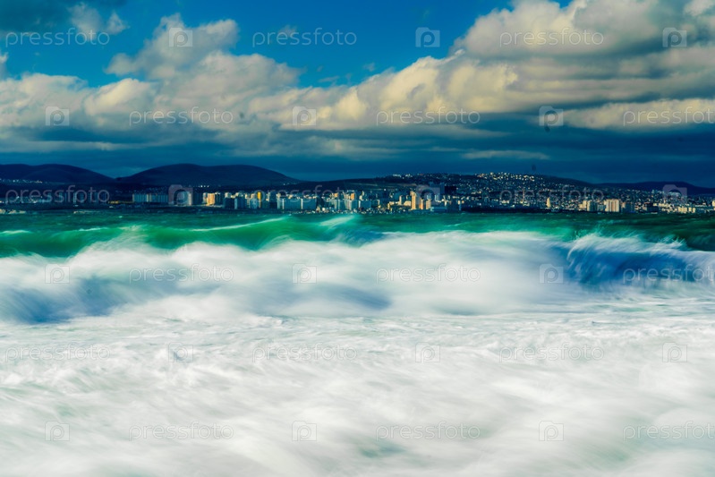 Курорт 'Кабардинка'.Черное море.Большие изумрудные штормовые волны.Много спрея и пены.На горизонте порт Новороссийск и Кавказские горы.Фото длинной выставки