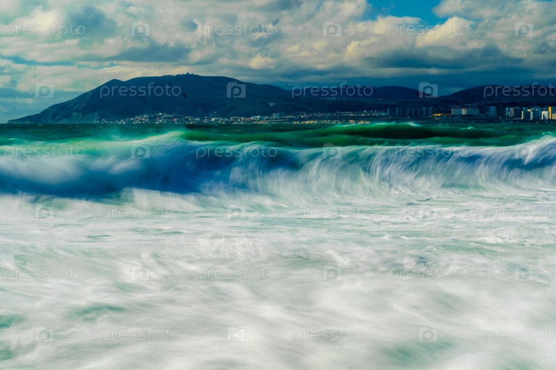 Курорт 'Кабардинка'.Черное море.Большие изумрудные штормовые волны.Много спрея и пены.На горизонте порт Новороссийск и Кавказские горы.Фото длинной выставки
