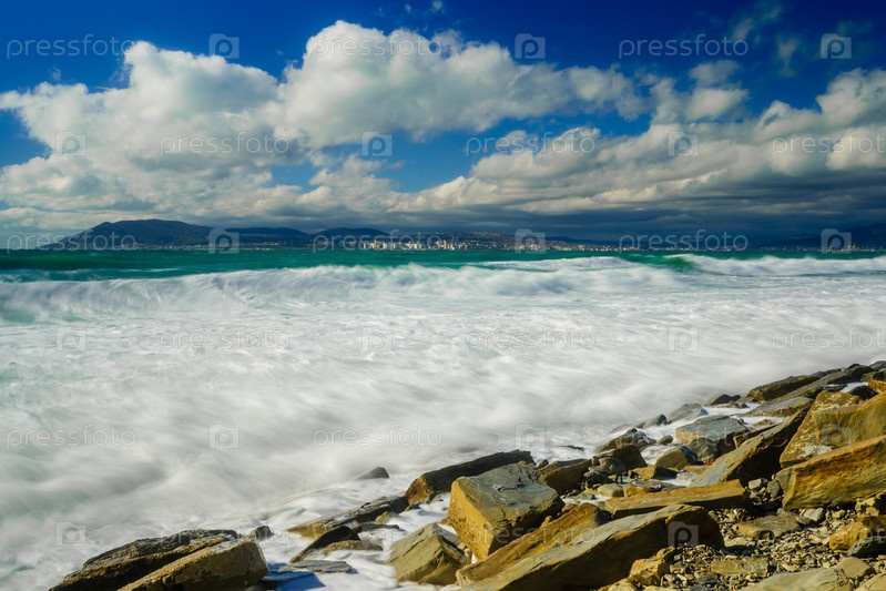 Курорт 'Кабардинка'.Большие зеленые штормовые волны в белой пены.На заднем плане порт Новороссийск и Кавказские горы.Огромные скалы на берегу.Фото длинной выставки