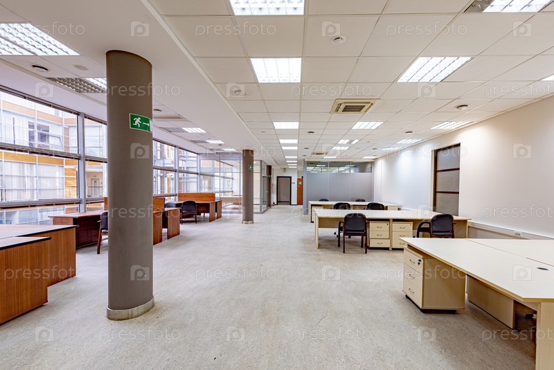 Интерьер многоэтажного бизнес-центра, офис с большим окном